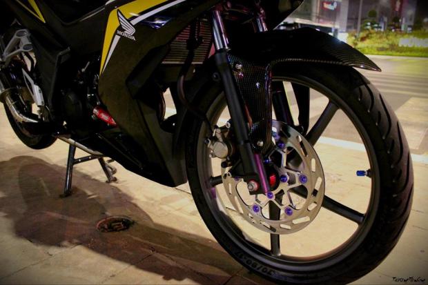 Nhìn xuống dàn chân trước ta sẽ thấy dè Carbon Fiber, cùng hình ảnh đĩa Winner zin được phay lại nhìn khá mới lạ + thớt lòng CNC cùng 9 chú ốc Proti cố định đĩa vào mâm
