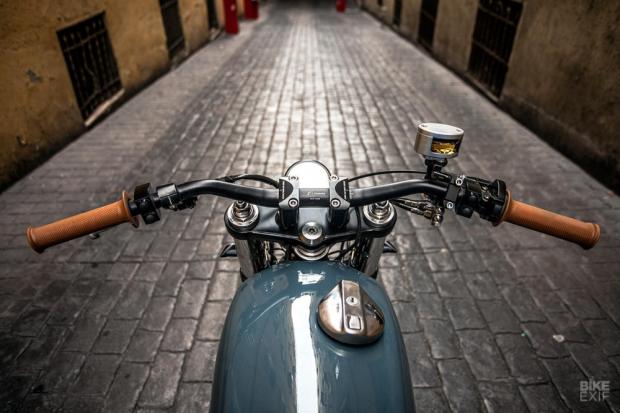 Vị trí ghi-đông lái tối giản với cụm ghi-đông Rizoma nhẹ nhàng và cặp tay lái bằng cao su êm ái Gonelli, ngoài ra chủ nhân còn sử dụng cốc dầu Rizoma Next tăng thêm phần sang trọng cho ghi-đông lái, màu Sơn trên bản độ là theo chủ ý của khách hàng mà Pepo không tự quyết được. Khách hàng của ông đã chọn một màu xanh xám ấm áp để phù hợp với màu sắc của một chiếc mũ bảo hiểm yêu thích của mình -Les Ateliers Ruby, và nó đã được thực hiện bởi các chuyên gia sơn xe máy Madrid Artenruta.