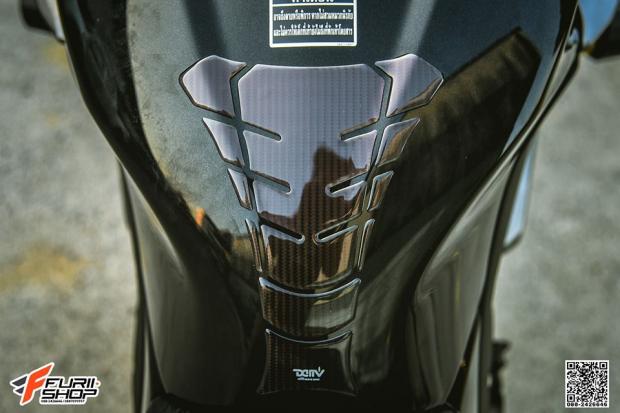 Ngay vị trí bình xăng được dán ôp Carbon mang thiết kế xương cá khá thể thao chạy dọc theo toàn thân.