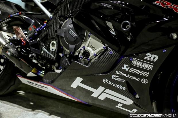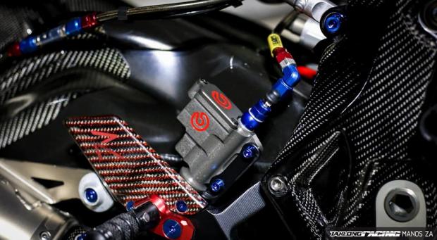 Nhiều chi tiết trên xe được tô điểm bởi ốp Carbon fiber, ngay vị trí dưới động cơ là bộ lườn dưới được phối tem HP4 và loạt sticker từ các thương hiệu nổi tiếng thế giới, ngay khối động cơ được che chắn và trang trí bởi bộ ốp GB Racing và full ốc titanium nổi trội.