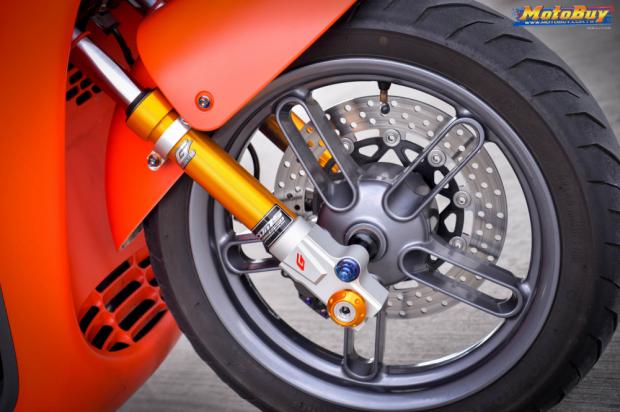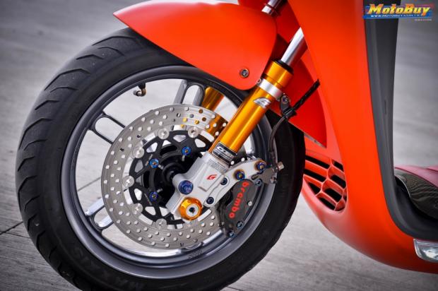Vỏ phuộc RRGS mang lại sự cứng cáp hơn cho bánh lái trước, dù thay đổi khá nhiều chi tiết ở dàn chân nhưng chủ xe vẫn giữ cho mình bộ mâm đúc nguyên thủy.