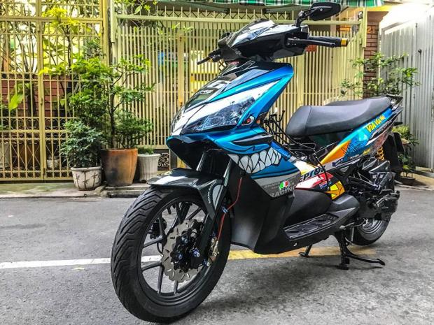 Đập vào mắt người xem đầu tiên đó chính là bộ cánh mang họa tiết chú cá mập hung tợn trên nền tem Candy, phong cách cá mập đang rất được ưa chuộng trong giới xe, nó được mô phỏng từ BMW S1000RR cùng những họa tiết từ tay đua huyền thoại Valentino Rossi.