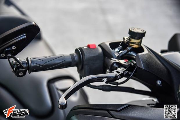 Hệ thống phanh lái được chủ nhân lựa chọn cùm phanh Brembo Billet cho bên phải tay lái, cuối góc lái trang bị gương gù CRG Arrow với thiết kế ấn tượng và giúp chủ xe dễ quan sát ở sau dễ hơn.