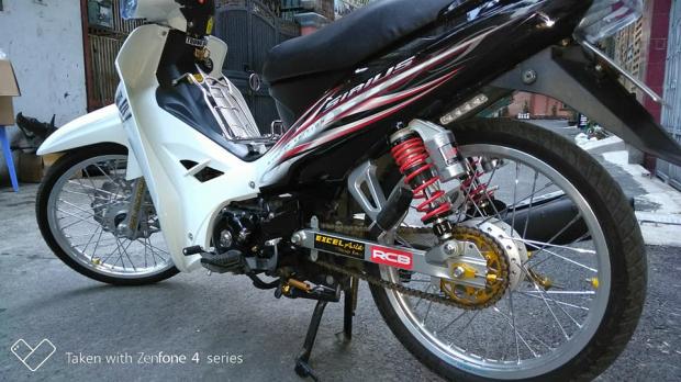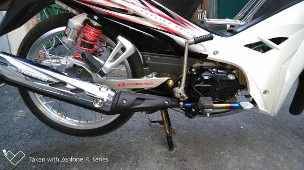 Lốc máy tạo điểm nhấn với ốc mâm lửa, giảm xóc sau Racing boy bình dầu cho độ nhún êm ái hơn cũng như tăng độ cứng cáp cho xe. Phía dưới óng ánh sắc vàng kim loại với đĩa tải nhôm CNC.