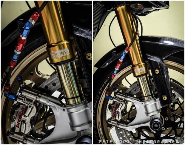 Dàn chân 'triệu đô' được chủ nhân lựa chọn cho con mãnh thú của mình với USD Ohlins, cặp phanh Brembo Nickel, dây dầu Earl's và ngắt dầu Stabliu, cặp mâm Marchesini Forged và bộ chắn bùn Carbon fiber.