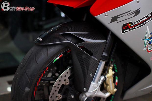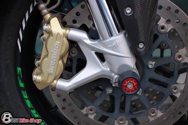 Ngoài trang bị phụ tùng tiêu chuẩn như cặp phanh Brembo, USD màu đen ra chủ xe còn trang bị bộ gù chống đổ CNC Racing màu đỏ ngay trung tâm cốt bánh khá bắt mắt.