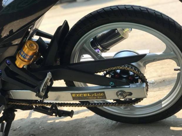 Chiếc xe côn tay Exciter 150 đã trở nên thể thao và đẳng cấp hơn khi được chủ xe nâng cấp thêm hàng loạt đồ chơi độ hàng hiệu cực chất và đắt giá như phuộc & trợ lực Ohlins, pô Leovince,... cùng điểm nhấn là cặp mâm 3 đao cho cảm giác lạ mắt khi gắn lên chiếc Ex 150.