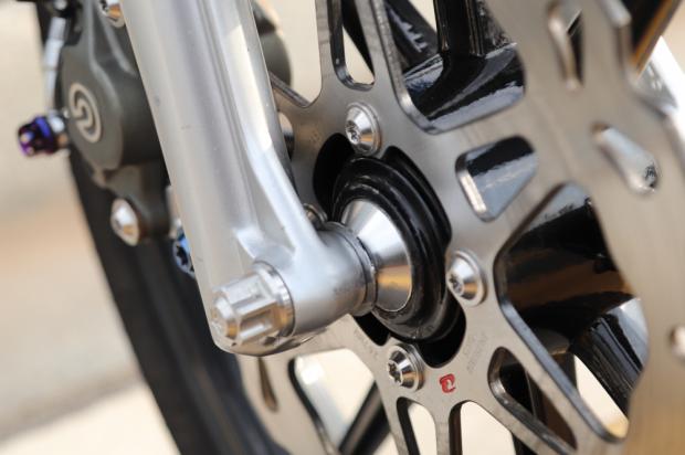 Dàn chân cứng cáp liền lạc với Mâm RCB 8 cây hàng hiếm đi cùng dàn thắng trước được đầu tư khá kỹ lưỡng với Heo Brembo Logo lớn và đĩa thắng RCB Chính hãng. Pát bắt heo được CNC khá tỉ mĩ.