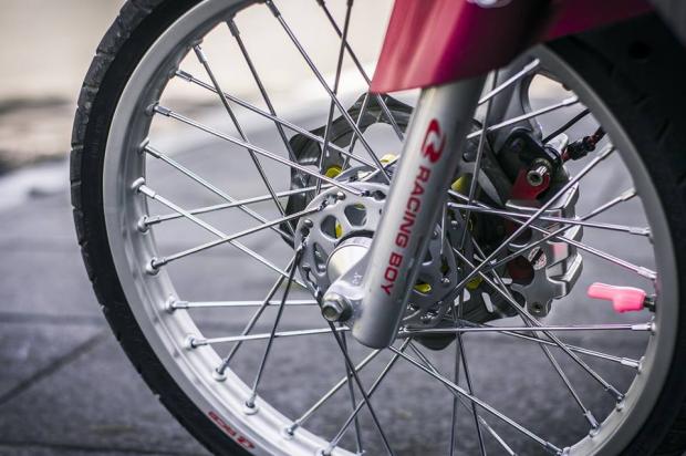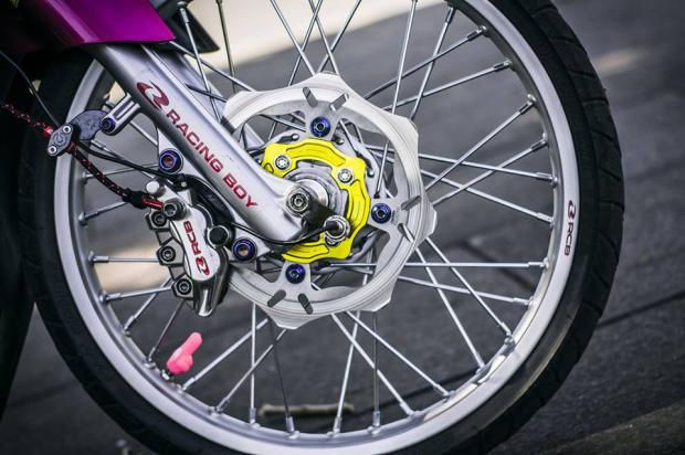 Hệ thống phanh được thay đổi với đĩa Galfer được đính chặt bằng ốc Titan kết hợp cùng heo Racing boy 2 pis .