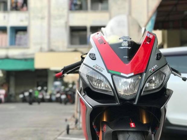 Dàn đầu thiết kế thể thao với cụm đèn pha chia 3, khẳng định thương hiệu từ lá cờ Ý được dán trung tâm, trang bị phụ thêm kính chắn gió Puig và pát chân kiếng Lightech khiến đầu xe đã gọn nay càng gọn hơn.