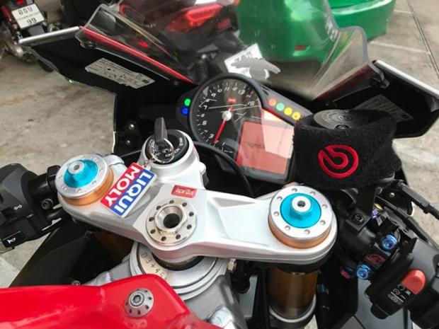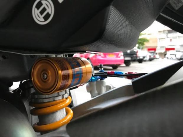 Ngoài những phụ tùng 'hàng hiệu' đi kèm từ khi xuất xưởng như USD Ohlins, phanh Brembo M50, mâm Marchesini ra thì chủ nhân còn tăng vẻ đẹp cho dàn chân bởi bộ dây dầu Earl's kết hợp ngắt dầu Stahlbus.