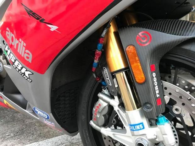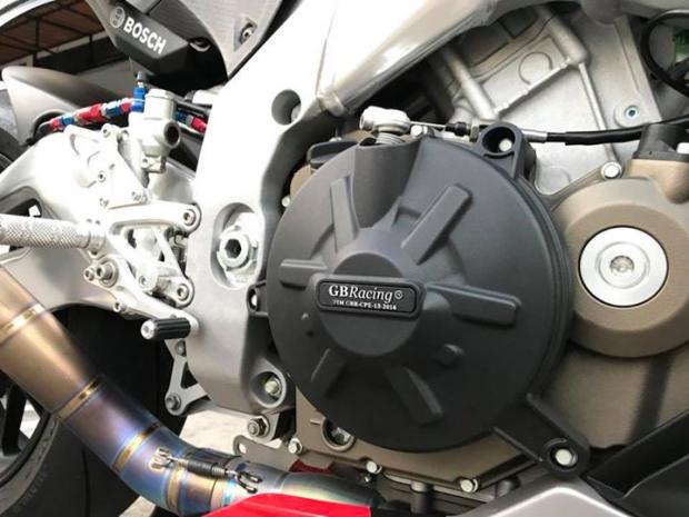 Aprilia RSV4 cũng là mẫu superbike duy nhất cho phép chủ xe có thể tùy chọn vị trí đặt động cơ trên khung, ngay khối động cơ được che chắn bởi ốp GB Racing.