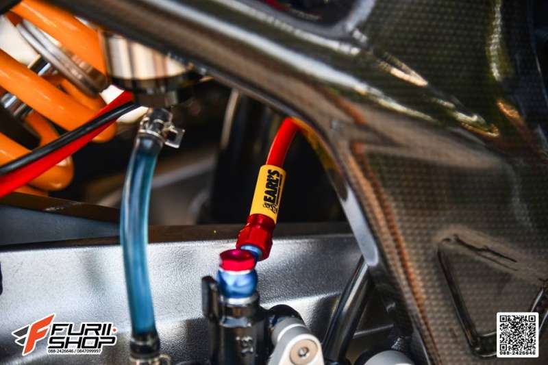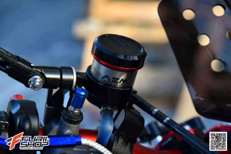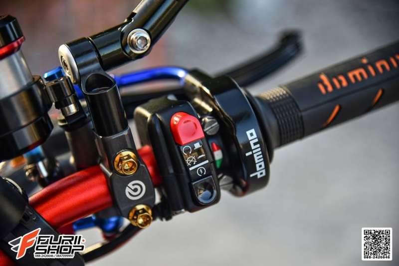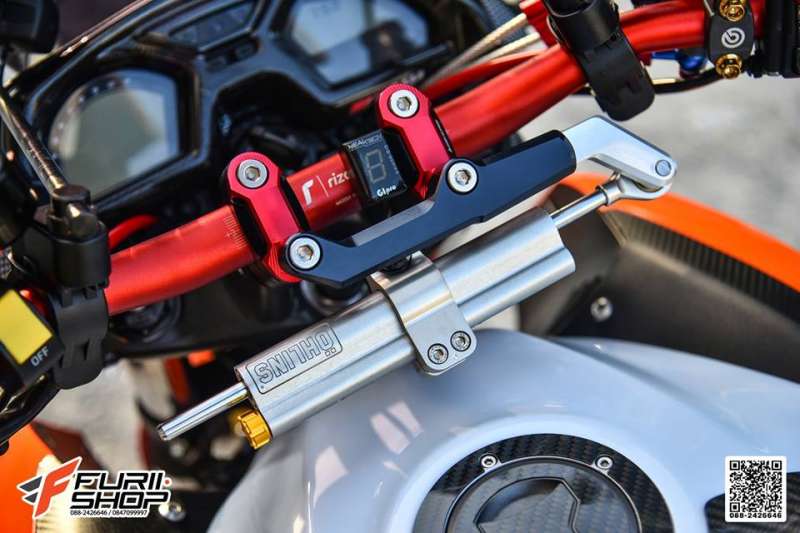 Chi tiết ghi-đông trần Rizoma được làm từ nhôm siêu nhẹ và nhuộm đỏ nổi bật, báo số điện tử, trợ lực Ohlins kết hợp pát CNC liền lạc. Đây thường là vị trí đáng chú ý nhất cho những tay chơi yêu thích dòng xe ghi-đông trần.