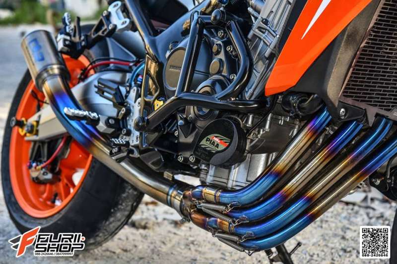 Cuốn bô được làm từ chất liệu titanium-cho trọng lượng siêu nhẹ, tản nhiệt tốt và lên màu khi ở nhiệt độ cao, được phô diễn dưới khối động cơ trần trụi.
