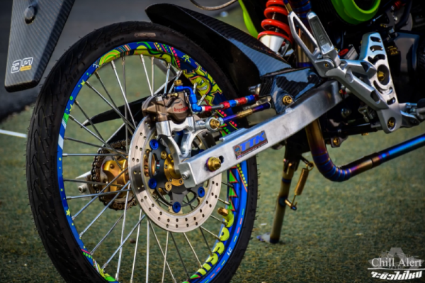 Dàn chân mỏng manh đầy gợi cảm với niềng nhôm Rossi mang những họa tiết lạ mắt, không chỉ tăng độ cá tính của chủ xe mà nó còn giúp người lái cảm nhận mạnh mẽ độ lướt & bốc hơn. Hệ thống phanh ở bánh lái trước được nâng cấp đồng bộ với nhau, chúng ta sẽ thấy đĩa moto3 kết hợp cùng heo Brembo đi kèm dây dầu Earl's.