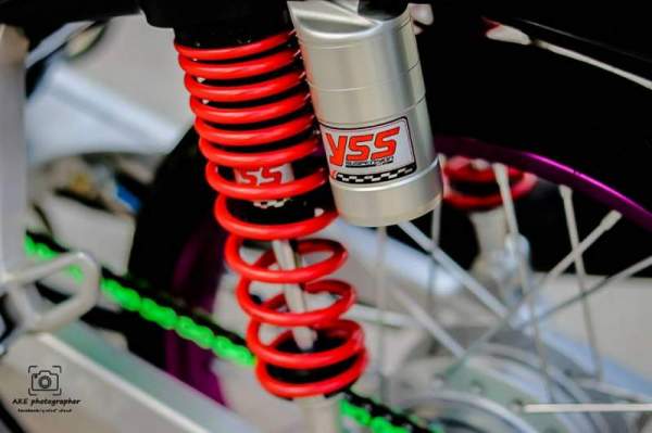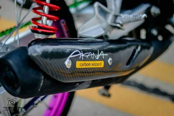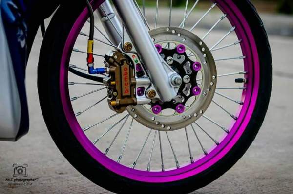 Dàn chân mỏng manh với niềng nhôm mang sắc màu tím cực đẹp, hệ thống phanh được nâng cấp với đĩa Moto3 kết hợp cùng heo Brembo Billet HP đi kèm dây dầu Earl's.