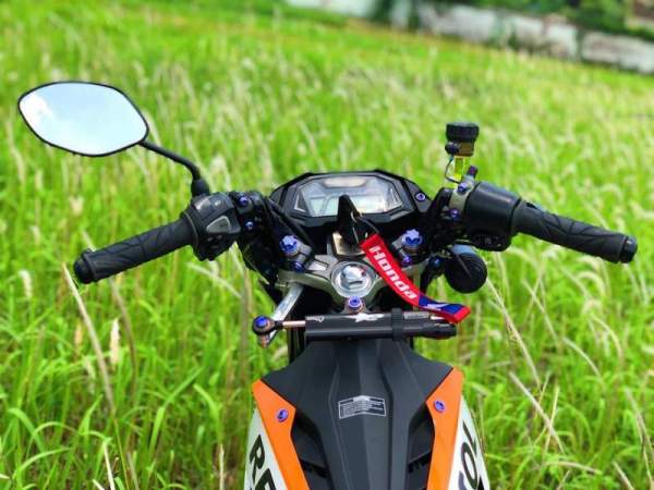 Ghi đông được trang trí nhiều chi tiết ốc Proti kết hợp cùng bao tay Spider êm ái góc cạnh hơn zin khá nhiều. Trợ lực Ohlins kẹp cổ hành trình 90mm giúp đầu xe ổn định khi chiến mã phi tốc độ cao