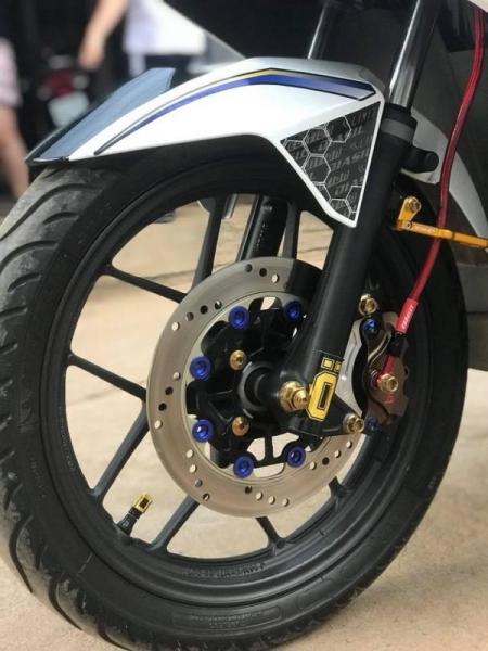 Dàn chân sử dụng đĩa Apido kết hợp cùng heo dầu kiểu dáng Brembo 2pis đối xứng và dây dầu Galfer cùng vài chú ốc vàng ti tí