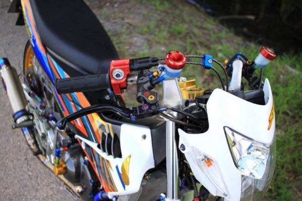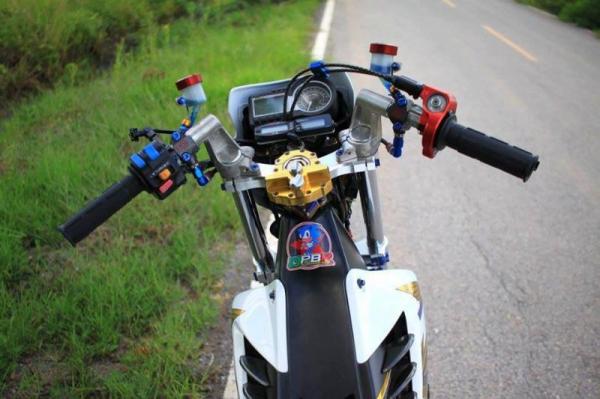 Góc nhìn này ta sẽ thấy 1 bầu trời Titanium của những món đồ chơi như cổ pô, ống giải nhiệt ... Số gãy đã quá quen thuộc với anh em chơi xe độ , không chỉ mang sự thon gọn & thẩm mỹ cao mà còn giúp người lái có dáng ngồi thể thao để sang số linh hoạt hơn .