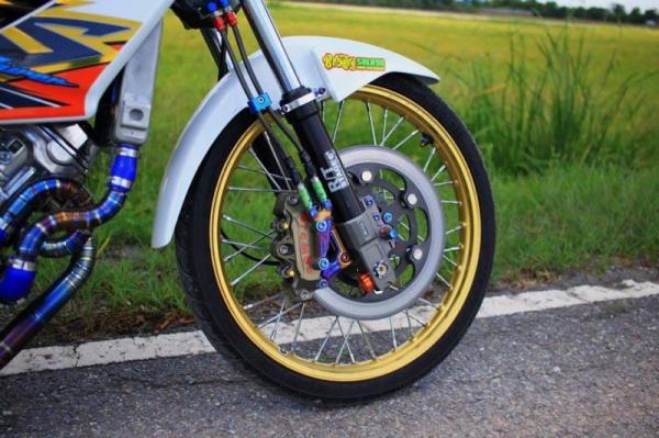 Dàn chân mỏng manh đầy gợi cảm với niềng nhôm óng ánh sắc vàng , vỏ phuộc zin được thay thế bằng vỏ phuộc Stage 6 với thiết kế độc đáo . Hệ thống phanh được nâng cấp với đĩa đồ chơi mang thiết kế tựa như đĩa gốm của các mẫu xe đua moto GP , đi kèm đĩa là heo Brembo billet .