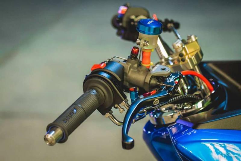 Góc nhìn tay ta sẽ thấy sự thay đổi mạnh mẽ trên ghi đông ở cánh phải với cùm tay thắng Brembo RCS đi kèm bình dầu Ant Lion được gắn 1 cách đầy thẩm mỹ, Việc nâng cấp này không chỉ hướng đến độ kiểng mà nó còn mang lại cảm giác êm ái & ổn định hơn cho người lái khi bóp phanh.