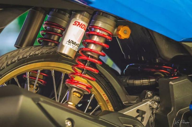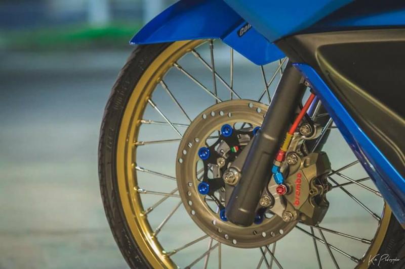 Dàn chân mỏng manh với niềng Excel óng ánh sắc vàng cực đẹp, việc chơi bánh nhỏ là phát súng đầu tiên đến từ Thailand, kể từ đó độ bánh nhỏ ngày càng được ưu chuộng, không chỉ giảm trọng lượng xe để gia tốc nhanh hơn mà nó còn khiến xe trông lạ mắt & độc đáo hơn. Bên cạnh đó ta sẽ thấy hệ thồng phanh được nâng cấp mạnh với đĩa moto3 kết hợp cùng heo Brembo Billet đi kèm dây dầu Earl's.