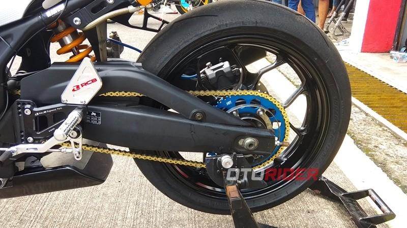 Dàn chân sau vẫn được giữ nguyên cặp mâm chữ Y zin. NSD của hãng RK 7 ly phục vụ cho đường đua. Bộ số gãy của hãng RCB.