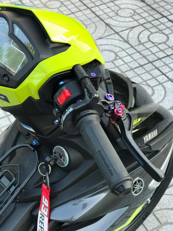 Phần đầu xe được chủ nhân của nó cắt gọn lại để lộ cặp cùm công tắc rời đồ chơi kết bợp cùng bao tay Barracuda phiên bản mới chính hãng được bán với giá tầm 350 ngàn đồng cực kì êm ái màu sắc và ngoại hình đơn giản dễ phối với rất nhiều dòng xe. Bên cạnh còn có tay thắng CRG Rc2 kết hợp cùng kính gù cùng thương hiệu giúp xe thêm linh lung hơn.