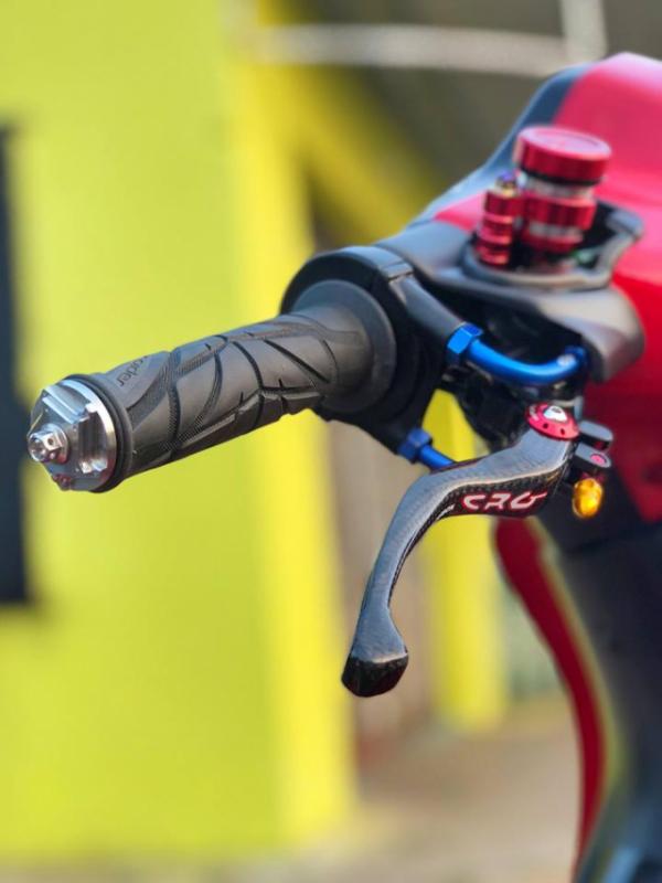 Ở góc ảnh này ta sẽ thấy chủ xe đã trang bị cùm thắng đồ chơi đi kèm bình dầu AEM, đi kèm đó là tay CRG có cấu tạo từ Carbon siêu nhẹ & sắc sảo trong từng chi tiết, nó được tích hợp núm chỉnh kiểu đầu đạn với chức năng di dời tay xa gần tùy vào khoảng cách tay của mỗi người khi bóp. 2 phía tay lái lấp đầy khoảng trống với bao tay Spifer đi kèm gù nhôm CNC có thiết kế kiểu Salaya. Để gia tốc nhanh hơn thì chủ xe đã trang bị cùm tăng Domino đi kèm ống ga Domino với hành trình ga được rút ngắn để gia tốc nhanh hơn.