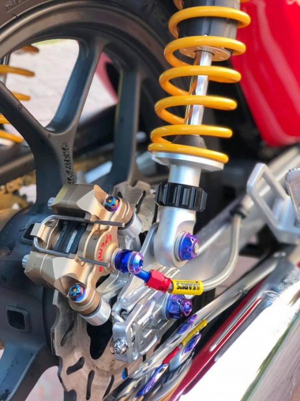 Dàn chân đầy hấp dẫn với mâm Sonic 150 được gắn hoàn chỉnh, tất nhiên phải gia công lại tất cả chi tiết thì mới hoạt động được như chế cục canh, pas heo... Hệ thống phanh được nâng cấp với đĩa Galfer kết hợp cùng cùng heo Brembo Moto3 thông qua sự hỗ trợ của pas nhôm CNC gia công từ máy cho độ chính xác cao, được biết mẫu heo này có giá trị ngất ngưỡng tầm 30 triệu đồng bởi piston có cấu tạo từ Titanium, chịu nhiệt cực tốt để xử lí an toàn trong mọi tình huống về phanh. Việc sở hữu em nó còn là khó khăn của nhiều anh em chơi xe. Chính vì lẽ đó mà những hãng sản xuất đồ chơi ở Thailand đã dựng lại mẫu heo đồ chơi có thiết kế tựa như Brembo Moto3, giá thành khá rẻ để thỏa đam mê cho anh em & trong hình là 1 dẫn chứng cụ thể.