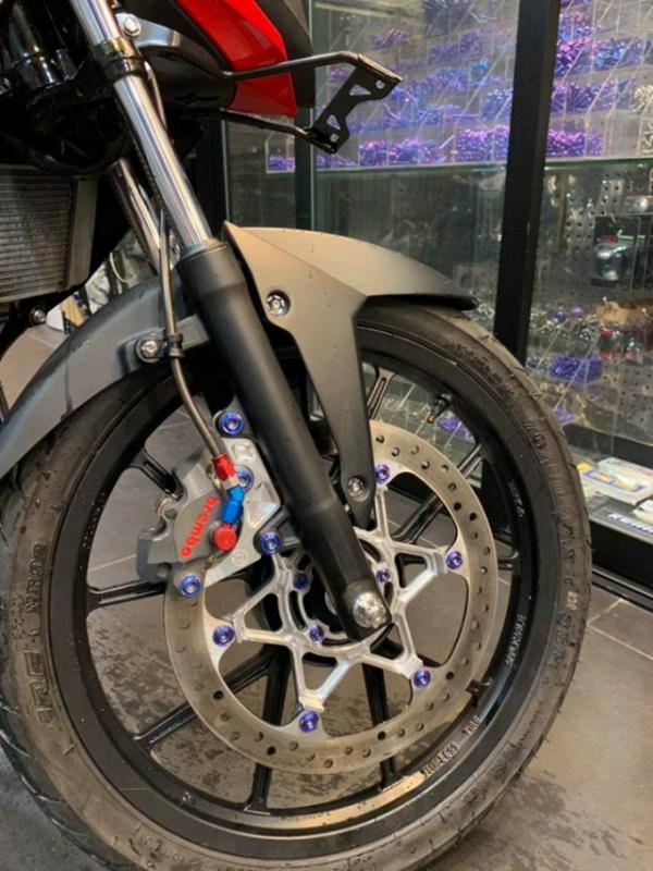 Nhìn xuống dàn chân trước ta sẽ thấy combo dây dầu Galfer được kết nối vào heo dầu Brembo Billet 2 pis đối xứng tuy nhiên do sử dụng mâm Daytona nên có lỗ ốc khác hoàn toàn mâm zin nên để bắt đĩa nguyên bản chủ xe phải làm thêm thớt lòng CNC nằm bên trong - Các chi tiết ốc điều được trang bị bằng chất liệu Gr5 được điện phân lên màu Titan.