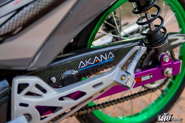 Gác chân sau được phay lại với kiểu dáng độc đáo, bên cạnh đó ta sẽ thấy cacte được ốp Carbon Akana toát lên sự sang trọng & đẳng cấp. Gắp zin được thay thế bằng gắp NuiRacing cấu tạo từ nhôm CNC gia công từ máy với độ sắc sảo cực cao, có thể thấy sự cá tính với gắp được nhôm màu hồng cực đẹp.