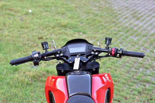 Ghi đông nguyên bản đã được thay thế bằng ghi đông CNC, việc thay thế mẫu ghi đông này sẽ phần nào thay đổi góc tay lái, giúp người lái tùy chỉnh sao cho thoải mái hơn, ngoài ra ta còn thấy cùm thăng tốc ở cánh phải với cấu tạo bên trong rút ngắn hành trình ga đáng kể, giúp xe gia tốc nhanh hơn.
