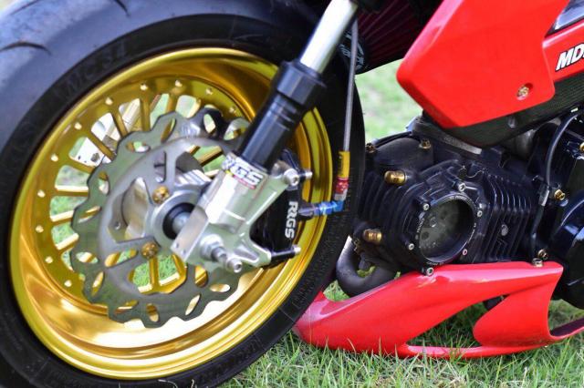 Hệ thống phuộc trước Upside down đến từ hãng RRGS cho độ nhún êm ái hơn rất nhiều, trong hình ta sẽ thấy sự hầm hố của mâm CNC có kích thước bánh trước 4 inch & sau là 6 inch, thiết kế mâm sắc sảo trong từng chi tiết. Hệ thống phanh được nâng cấp với đĩa Galfer kết hợp cùng heo RRCS đi kèm pas nhôm CNC để gắn hoàn chỉnh, dây dầu Earl's với đầu nối 90 độ.