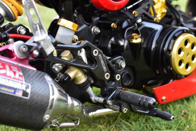 Lốc máy được tạo điểm nhấn với ốp CNC óng ánh sắc vàng, bên cạnh đó thì chủ xe còn trang bị số gãy đơn CNC giúp tư thế ngồi trở nên thể thao hơn cũng như việc rà thắng & sang số trở nên linh hoạt hơn, pen đạp zin được thay thế bằng pen đạp Brembo đi kèm bình dầu Ant Lion.
