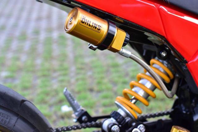 Hệ thống giảm xóc sau đến từ thương hiệu Ohlins đi kèm bình dầu rời, đây là mẫu phuộc có giá trị mang tên tuổi đẳng cấp quốc tế. gắn lên xe sẽ có chiều cao hơn phuộc zin, ngoài ra chân phuộc còn có núm chỉnh để mang lại sự êm ái cho xe đi kèm bình dầu rời.