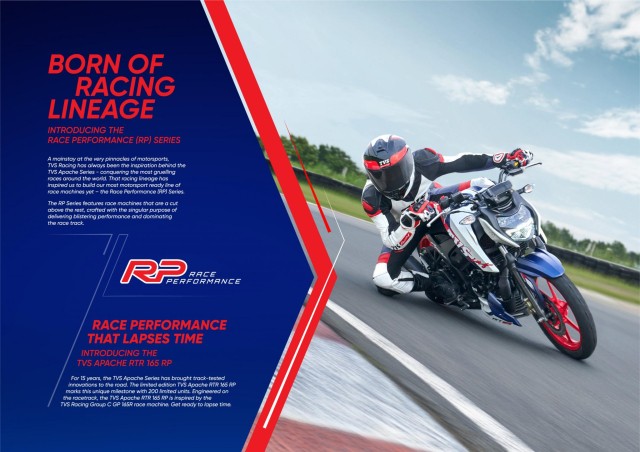 TVS Apache RTR 165 RP được sinh ra từ nguồn cảm hứng dựa trên chiếc TVS Racing Group C GP 165R đang chinh chiến tại giải đua INMRC. 'Chiến hữu thân cận' của tay đua K. Jagan, người đã cùng chiếc TVS Racing Group C GP 165R 9 lần giành giải vô địch INMRC.