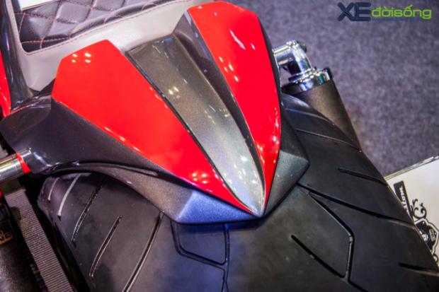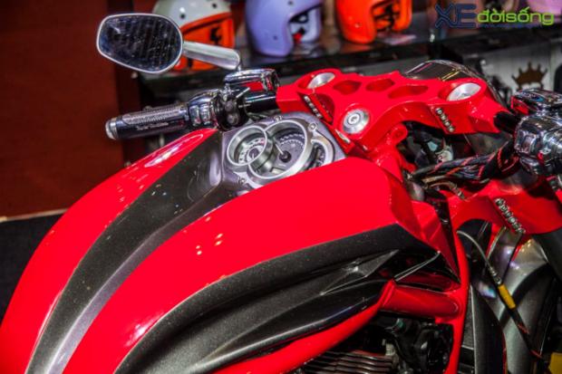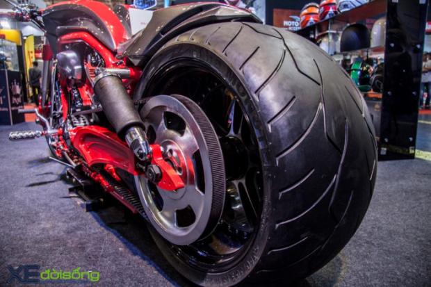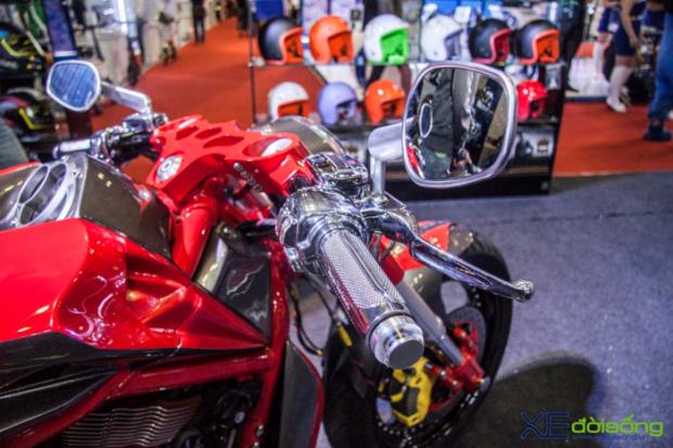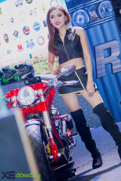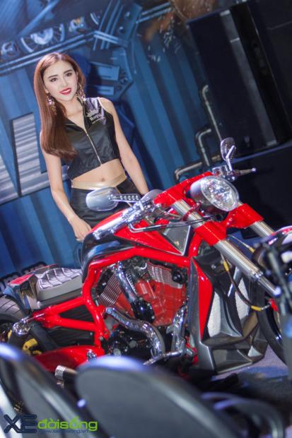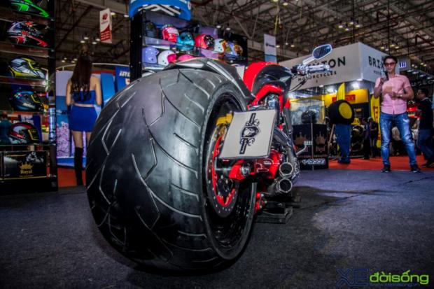 Với dáng vẻ cơ bắp của những chiếc cruiser truyền thống, V-Rod là nguồn cảm hứng cho các tay độ sáng tạo nên những tác phẩm hầm hố nhưng cũng rất “dị”, không giống ai. Vì vậy, bản độ tại gian hàng Royal thu hút không ít khách thăm quan với vẻ ngoài cơ bắp, hầm hố và cực kỳ mạnh mẽ. Chiếc xế khủng bánh béo này cũng được dịp so dáng với những chân dài nóng bỏng tại Vietnam Motorcycle Show 2017.