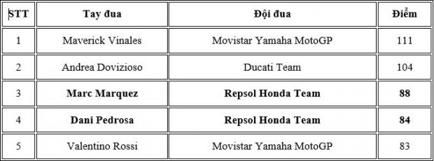 Trong khi đó, hai tay đua của Movistar Yamaha là Vinales và Rossi lại có một ngày thi đấu không thể tệ hơn. Cả hai tay đua đều có vị trí xuất phát thấp (Vinales và Rossi xuất phát lần lượt ở vị trí thứ 9 và 13) và sau đó Rossi đã cán đích ở vị trí thứ 8 trong khi Vinales bị tụt xuống tận vị trí thứ 10. Kết quả này đã đẩy Rossi xuống vị trí thứ 5 trên bảng xếp hạng thế giới, trong khi đó Vinales vẫn “đứng vững” ở vị trí nhất bảng với 111 điểm.