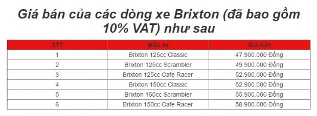 Sau 1 tháng kể từ ngày ra mắt điều tiên tại triển lãm xe máy tại Sài Gòn, nhà phân phối của hãng Brixton đã nhập về lô xe côn tay Brixton BX125 và BX150 đầu tiên về Việt Nam. Những người yêu dòng xe côn tay có kiểu dáng độc đáo này đã có thể liên hệ mua xe ngày từ bây giờ.