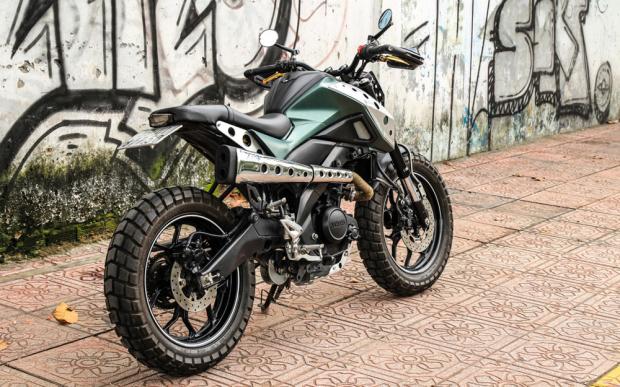Mẫu naked-bike 150 phân phối Yamaha TFX độ theo phong cách scrambler với nhiều chi tiết đặc trưng. Đây là sản phẩm của một xưởng độ tại Sài Gòn.