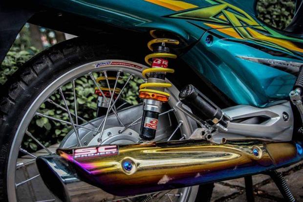 Ốp pô được Titan hóa đổi màu phá cách, phuộc sau Racingboy cho xe thêm cơ bắp, niền nhôm Yoko