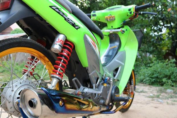 Chân chống nghiêng và cần số Titan, ngoài ra gác chân phay kiểu với nhiều họa tiết đúng phong cách xe Thái
