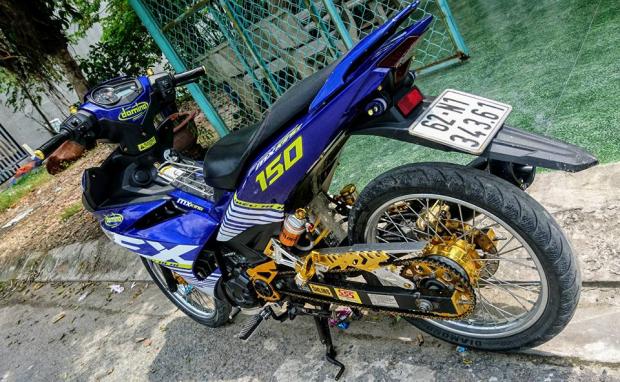Cánh trái đầy nổi bật với sắc vàng đến từ các món đồ chơi như : Mang cá CNC , gác chân Biker , mang cá Racing boy , phuộc Ohlins bình dầu rời giúp cải thiện độ nhún êm ái hơn so với zin . Đĩa tải CNC tạo điểm nhấn nhẹ để khoe sợi sên vàng óng .