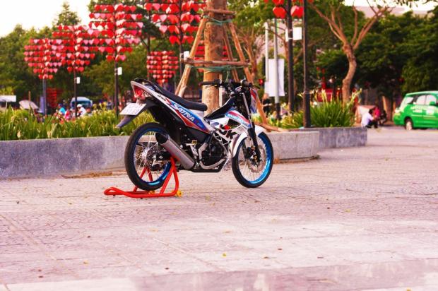 Khoác cho mình bộ áo bao phủ bên ngoài mang phong cách Satria đậm chất thể thao , yên đã được gọt lại với kiểu dáng góc cạnh ôm sát theo xe đầy thẩm mỹ .
