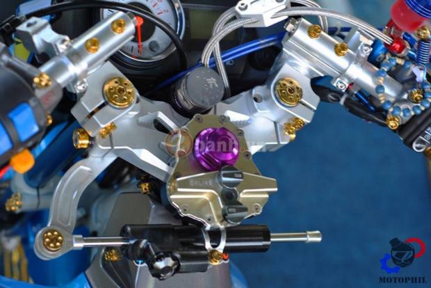 Cận cảnh dàn ghi đông với cùm tăng tốc, cùm côn Brembo, ghi đông nhôm cnc cùng các chi tiết trang trí rực rỡ