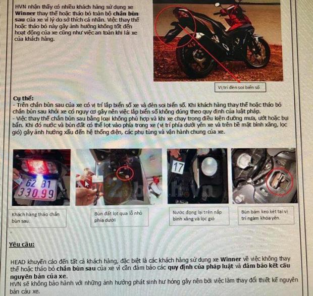 Honda khuyến cáo không được tháo chắn bùn sau của Winner 150 vì gây ra hậu quả nghiêm trọng.