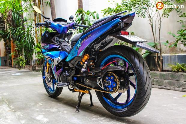 Để tạo sự khác biệt cho thú cưng của mình , chủ xe đã pha nhẹ sự phá cách trong việc độ lại dàn áo & phủ cho mình lớp sơn chuyển màu theo góc nhìn đầy ấn tượng . Được biết sơn chuyển màu theo góc nhìn còn gọi là sơn Mystic & thường sẽ có 2 sắc chuyển màu như xanh lá - tím , xanh dương - tím .... Tuỳ theo góc nhìn mà màu sơn sẽ phản chiếu màu xanh dương hoặc tím , đôi khi sẽ có những vùng màu giao nhau trở thành xanh dương lẫn tím khá đẹp mắt . Đi đôi với bộ cánh chuyển sắc là sự xuất hiện của con ' cá mập ' với hàm răng sắc nhọn đầy hung tợn làm điểm nhấn chính . Ngoài ra , trên bộ cánh còn có những họa tiết lưu giữ chữ kí của tay đua huyền thoại Valentino Rossi .
