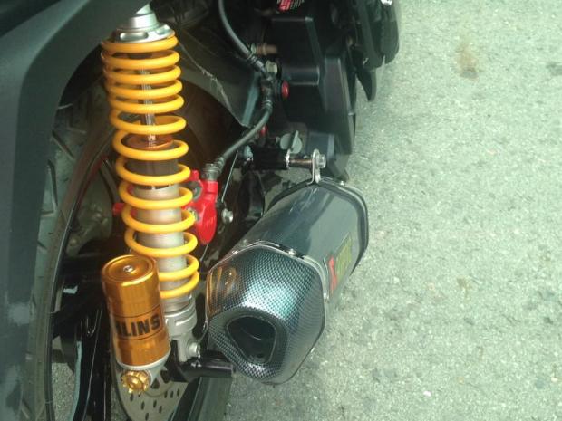 Ngoài hình dáng hầm hố lực lưỡng ra chiếc Sh 150i còn đang sở hữu cho mình nhiều đồ chơi cực chất, đến từ các thương hiệu nỗi tiếng trên thị trường chơi xe bây giờ như tay thắng CRG, phuộc Ohlins bình dầu và pô Akrapovic