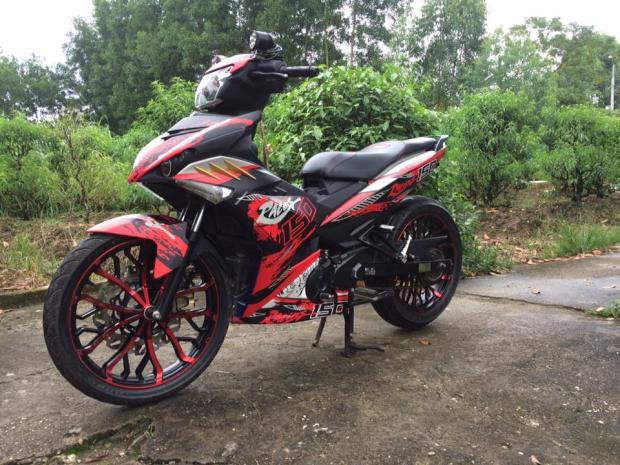 Khoác cho mình bộ cánh đậm tem đấu đậm chất thể thao mang phong cách Racing , phần yên được gọt lại với kiểu dáng 2 tầng tạo sự góc cạnh cũng như êm ái khi ngồi . [i]Dàn chân cứng cáp với mâm Kuni ( còn gọi là mâm nhện ) , đĩa đến từ thương hiệu Racing boy .
